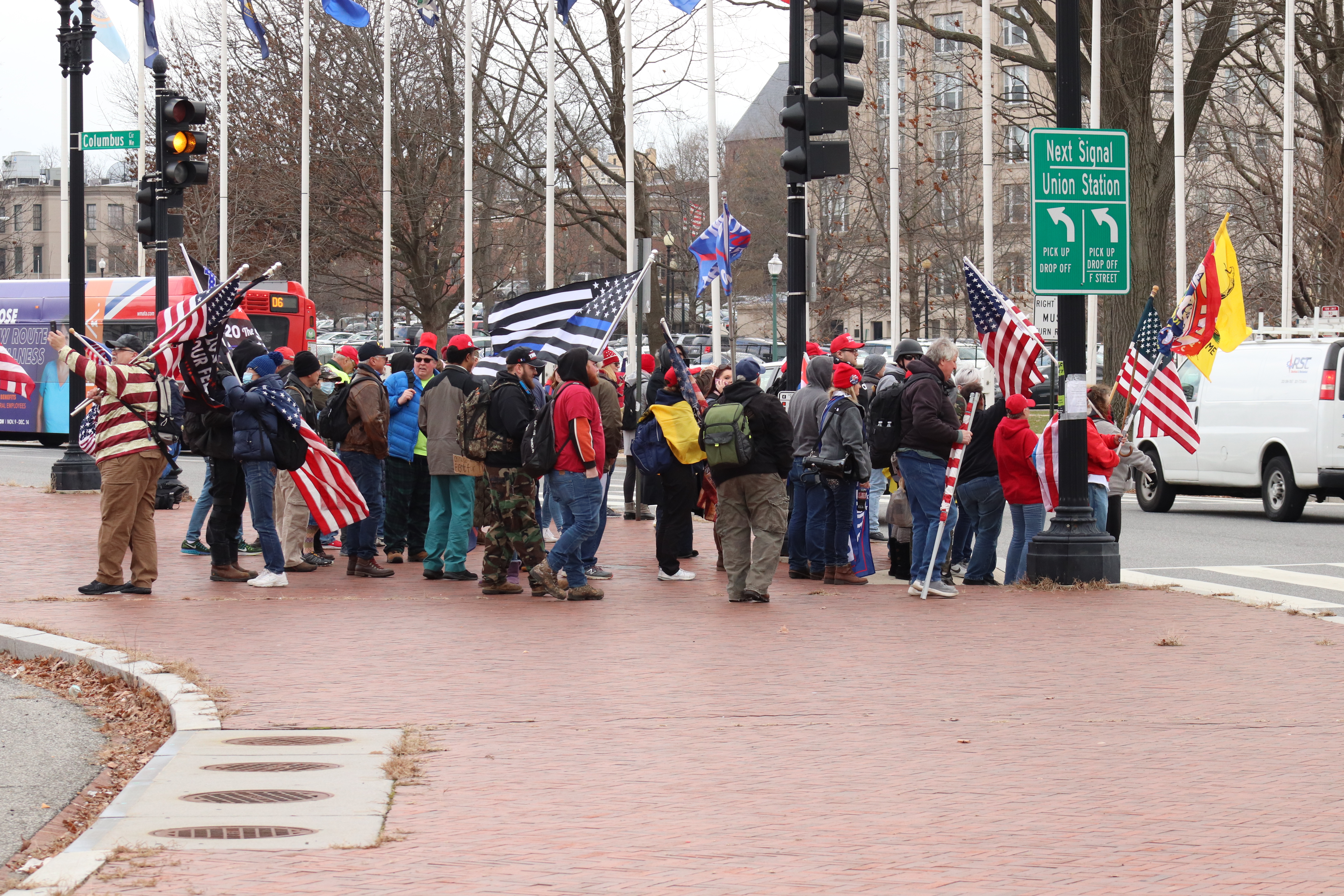 Gadsen flag, Betsy Ross flag and Thin Blue Line flag used at the January 6th insurrection.