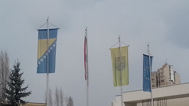 The EU flag is sometimes used by non- EU countries to express willigness to join or to show support for the European values. The first image shows the EU flag being placed in the Ukrainian parliament, the second the EU flag being flown in Bosnia.