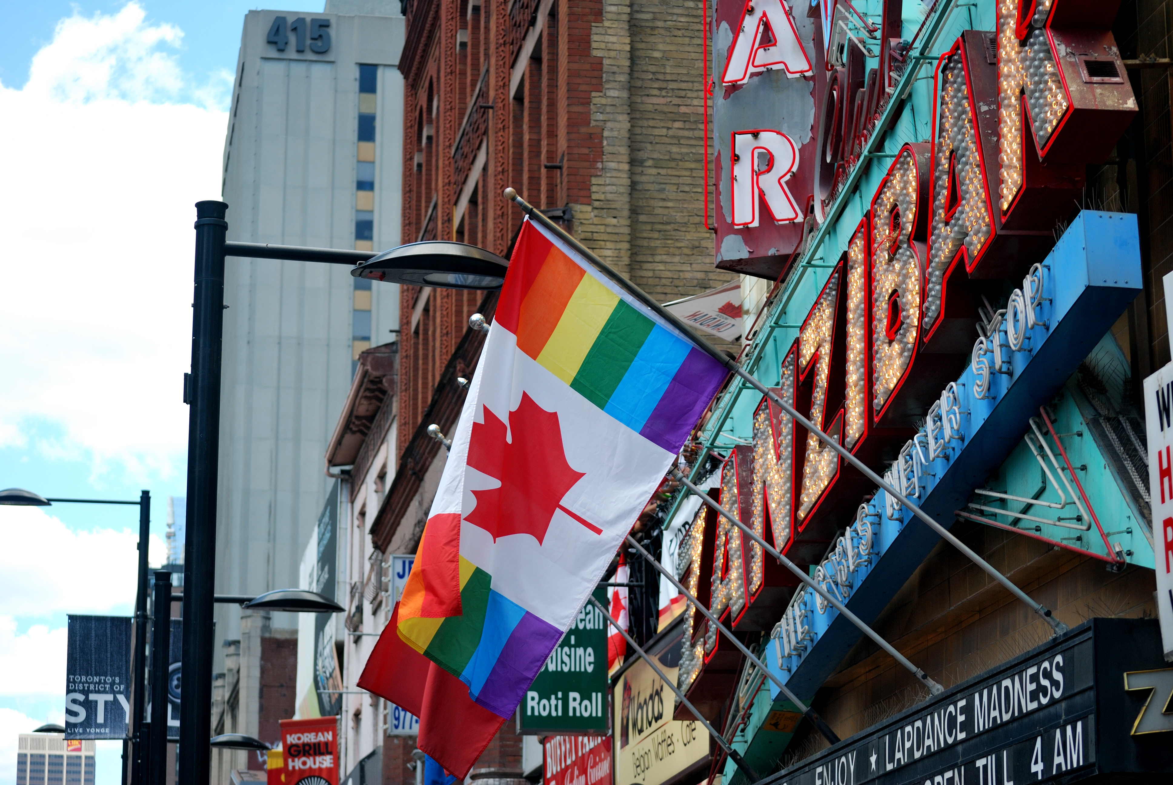 The first pride flag with a pink stripe and a Canadian pride flag version